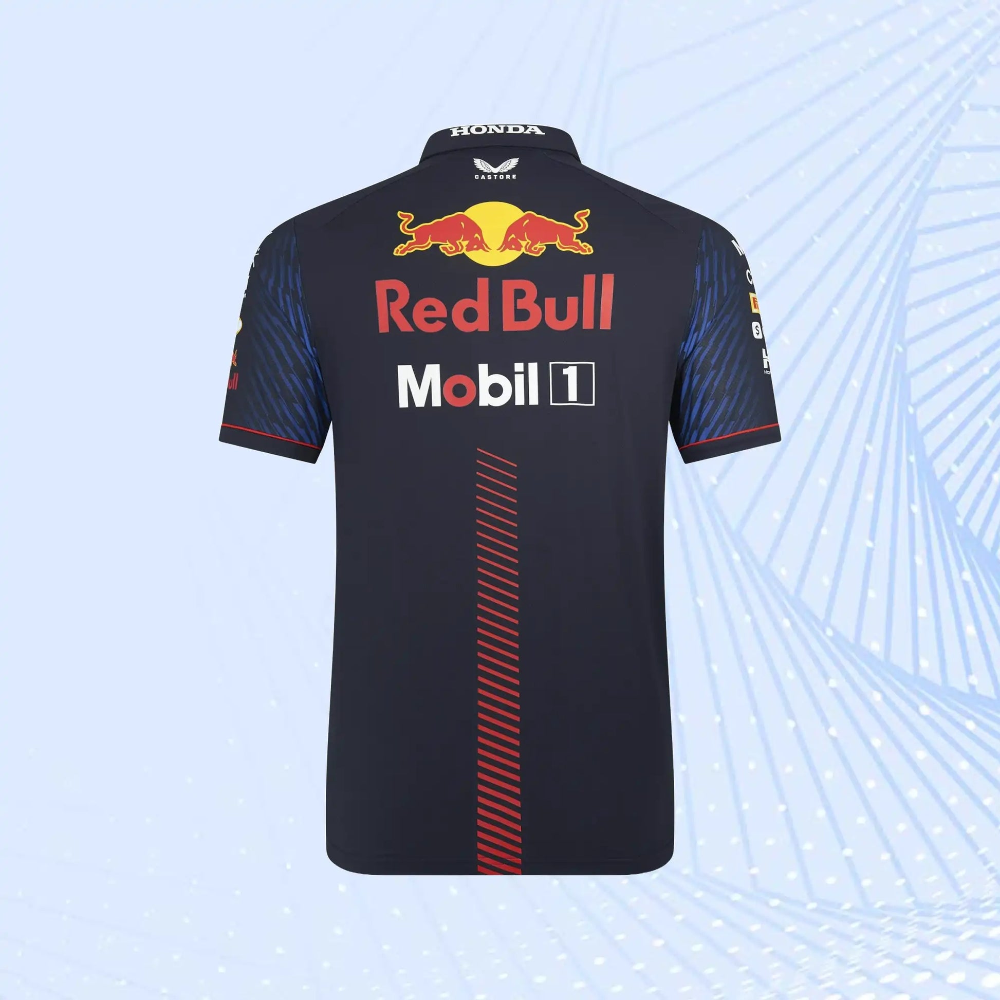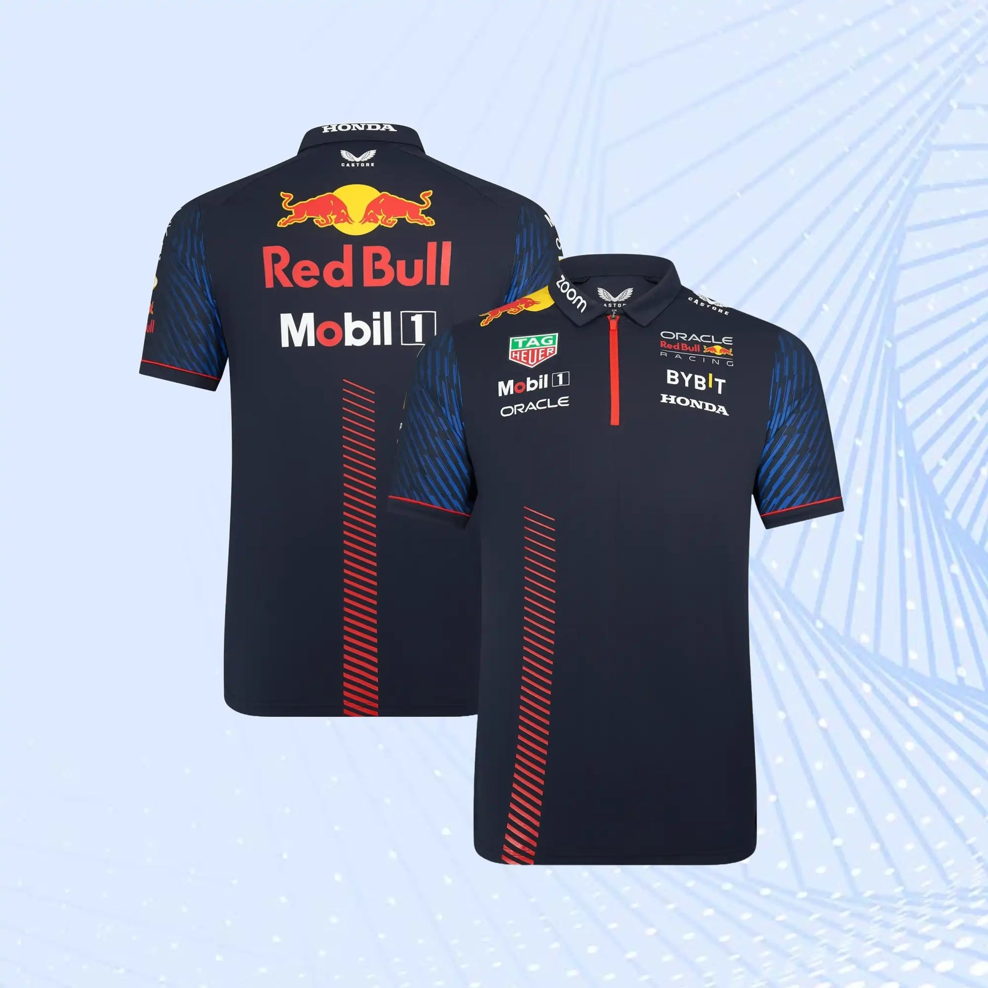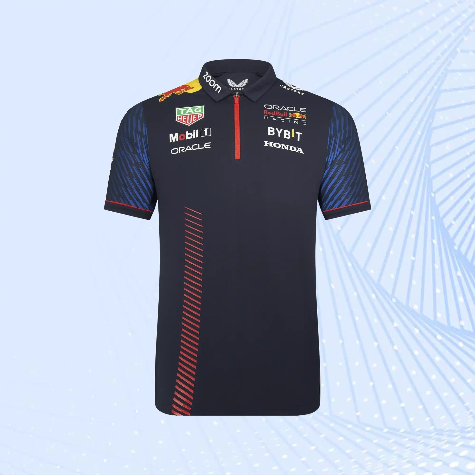 Take your passion for the Red Bull Racing Formula 1 team anywhere and everywhere with the 2023 Replica range. The team polo features a quarter-zip neck for a sleek trackside ethos along with useful temperature regulation and has heat-sealed team and sponsor graphics for the essential RBR Formula One look. Graphic print on the sleeves and asymmetrical stripes on the front add to the race-ready aesthetic.
