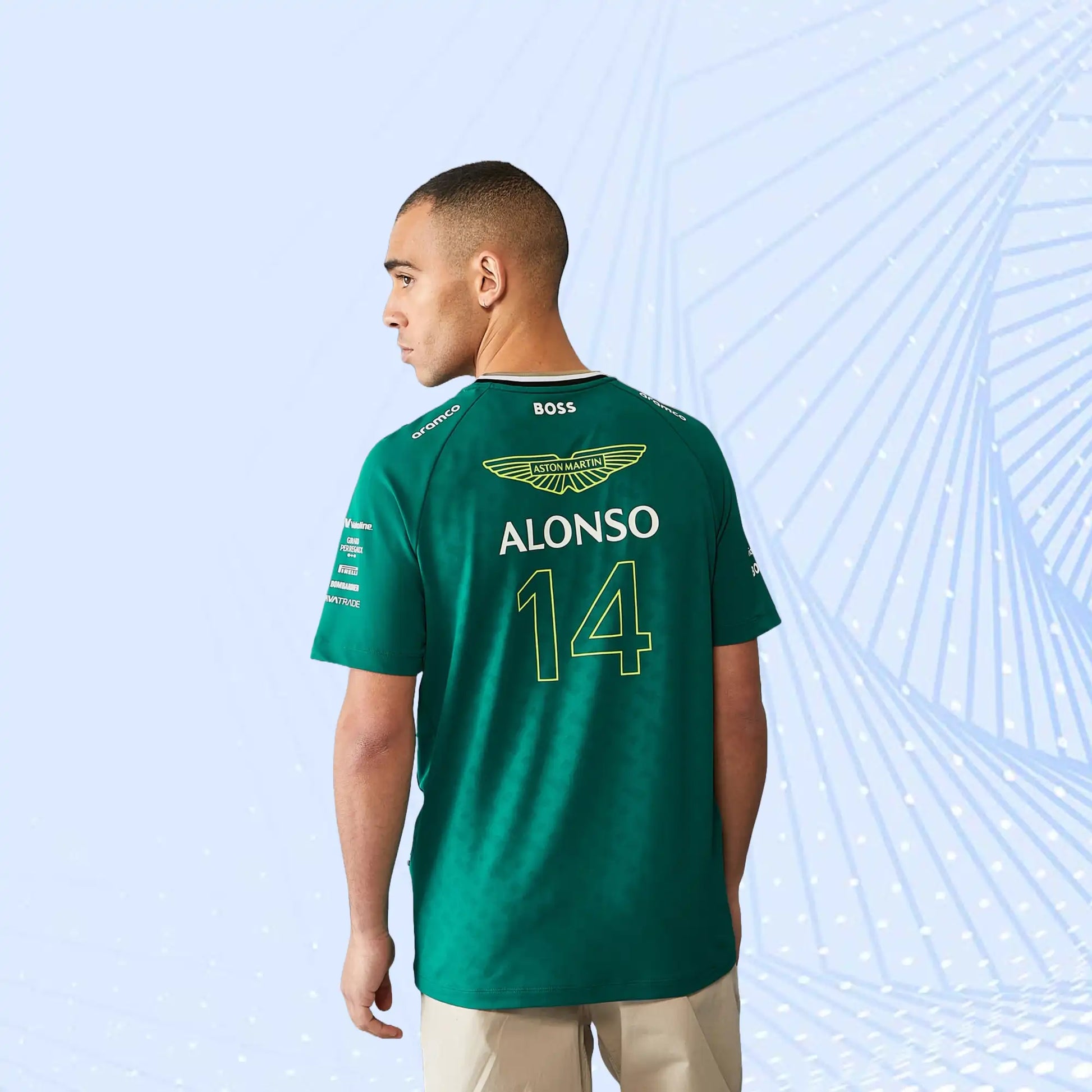 The official 2024 Fernando Alonso Team Replica T-shirt, as worn by Fernando throughout the 2024 Formula One® season. Part of the official 2024 replica teamwear collection, Fernando's driver T-shirt features all the updated Aston Martin Aramco Formula One® Team and sponsor branding, including a BOSS tonal monogram pattern and Fernando 'Alonso 14' rear print.