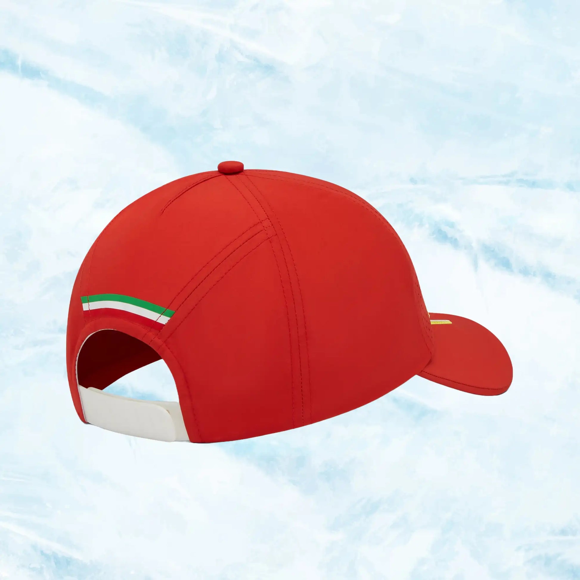 The 2024 Replica collection’s baseball hat is inspired by the official model worn by the Scuderia Ferrari Team during the Formula 1 season. Emblem of unwavering Ferrari support, the item is made unique by contrast graphic details, the laser-cut perforated motif on the crown and the Italian flag colours on the visor’s edge. Made with at least 70% recycled material, the accessory features a six-panel construction and snap-button fastening at the back, and is further customised with the iconic Ferrari Shield at the front.