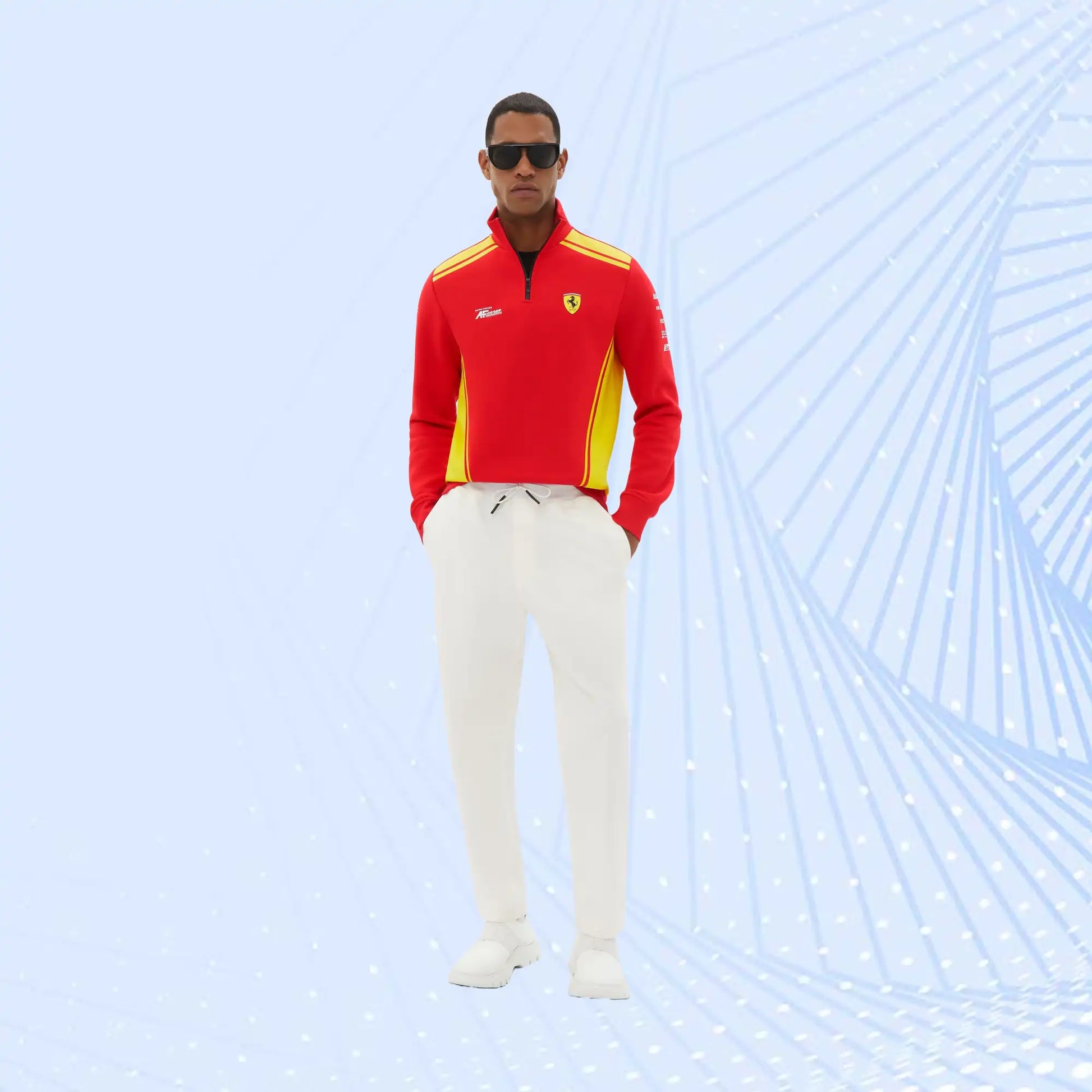 The garment, made of soft cotton-blend French terry, was created to be worn on and off the race track and is enhanced by contrasting yellow details, a tribute to the heritage of the city of Modena, and the unmistakable sponsor logos. With large kangaroo pocket.