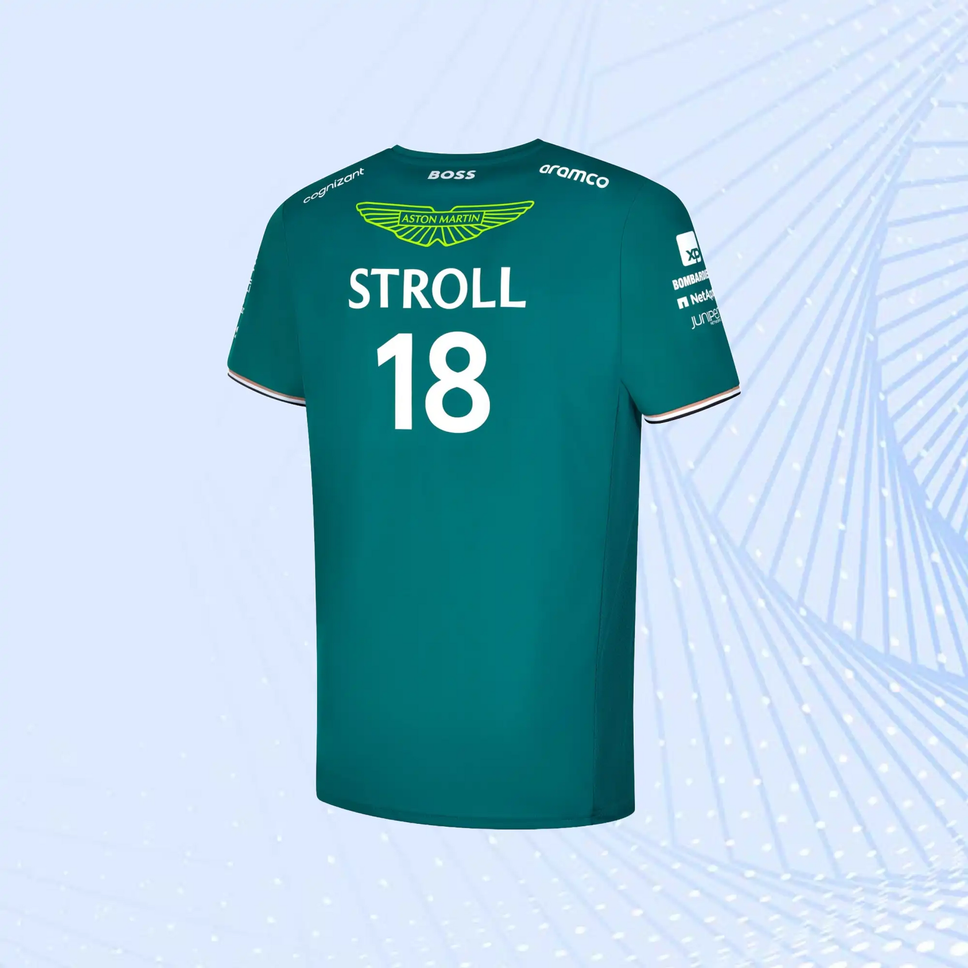 Take your pride in the Aston Martin F1 team from the track to the street with the official 2023 Replica range. This collection was designed in collaboration with Hugo Boss to embody the understated luxury and iconic style of Aston Martin while utilizing the latest fabric and performance technology. This classic tee has iconic Aston Martin stripe tape detailing on the shoulders and cuffs, and team and sponsor branding on the chest, back and sleeves for a quintessential Formula One look you can wear anywhere. Stroll’s personal details are featured front and back for you to show your support anywhere you go. The semi-fitted style makes it a comfortable choice wherever you decide to take it.