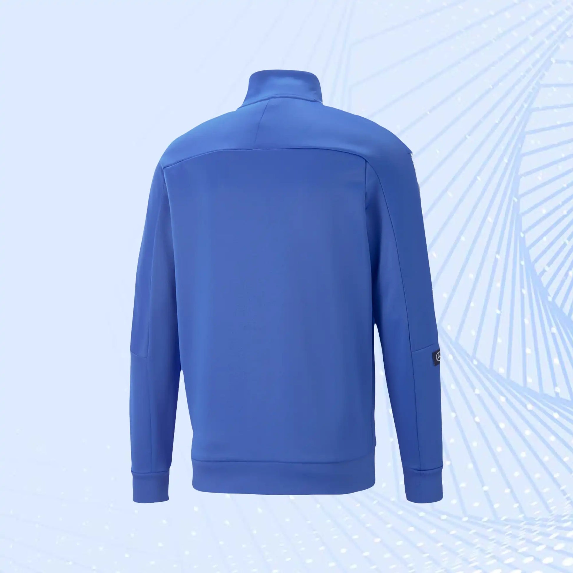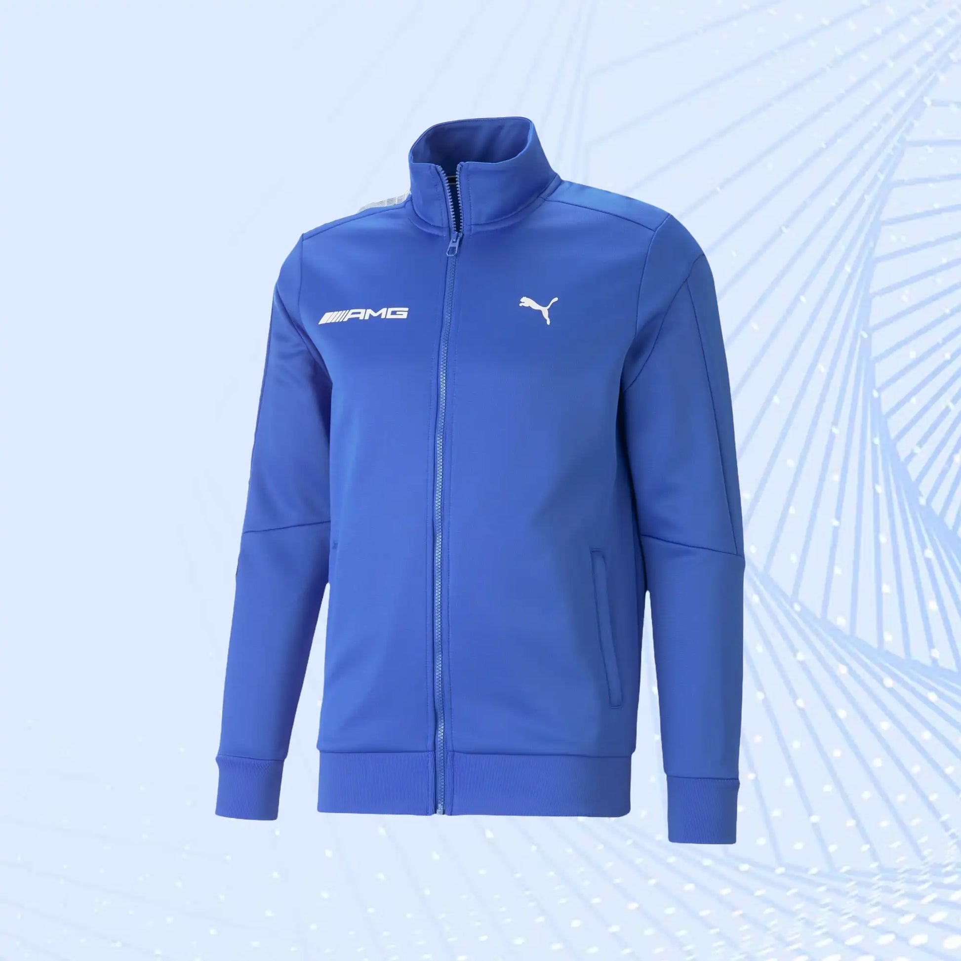 Get fully kitted out for the 2023 F1 season with the official Mercedes AMG Petronas team collection by Puma. This track jacket has a sleek, stylish silhouette and AMG and Puma logos on the chest as well as printing on one shoulder. The full zip and high collar give you a classic fitted look that will look equally great trackside or in the streets.