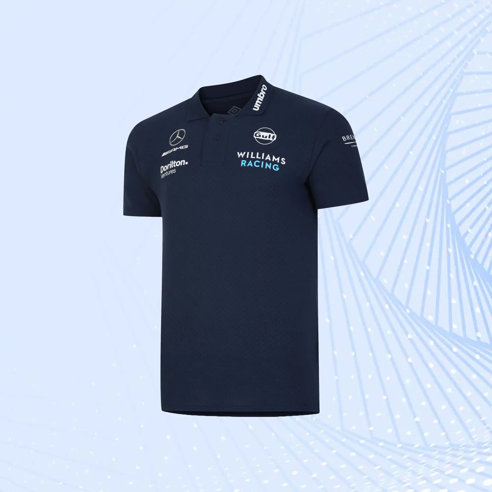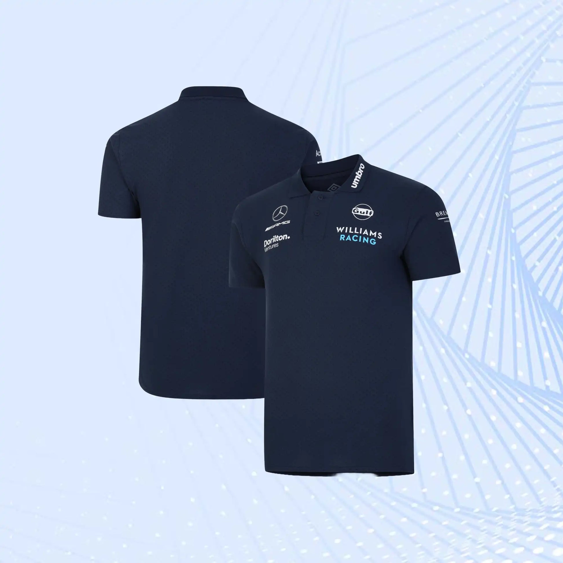 Show off your team spirit with the official Williams Racing 2023 Replica range. This classic polo is an iconic part of the F1 look and features a broad two-button placket with a flat knit ribbed collar. A discreet all-over dot pattern provides the base to the heat-applied team and sponsor graphics, and a twin-needle hem with side vents ensures a good fit and comfortable freedom of movement.