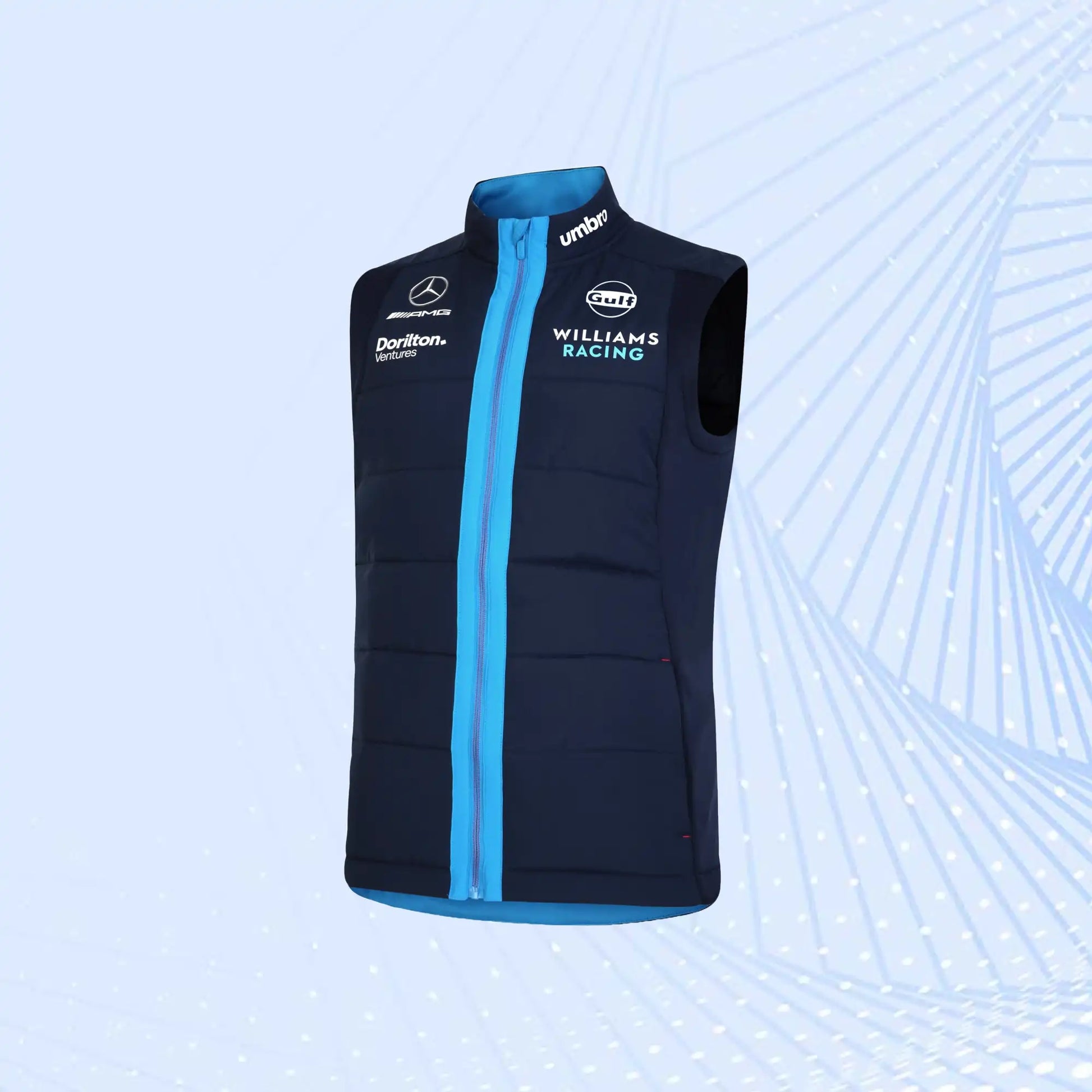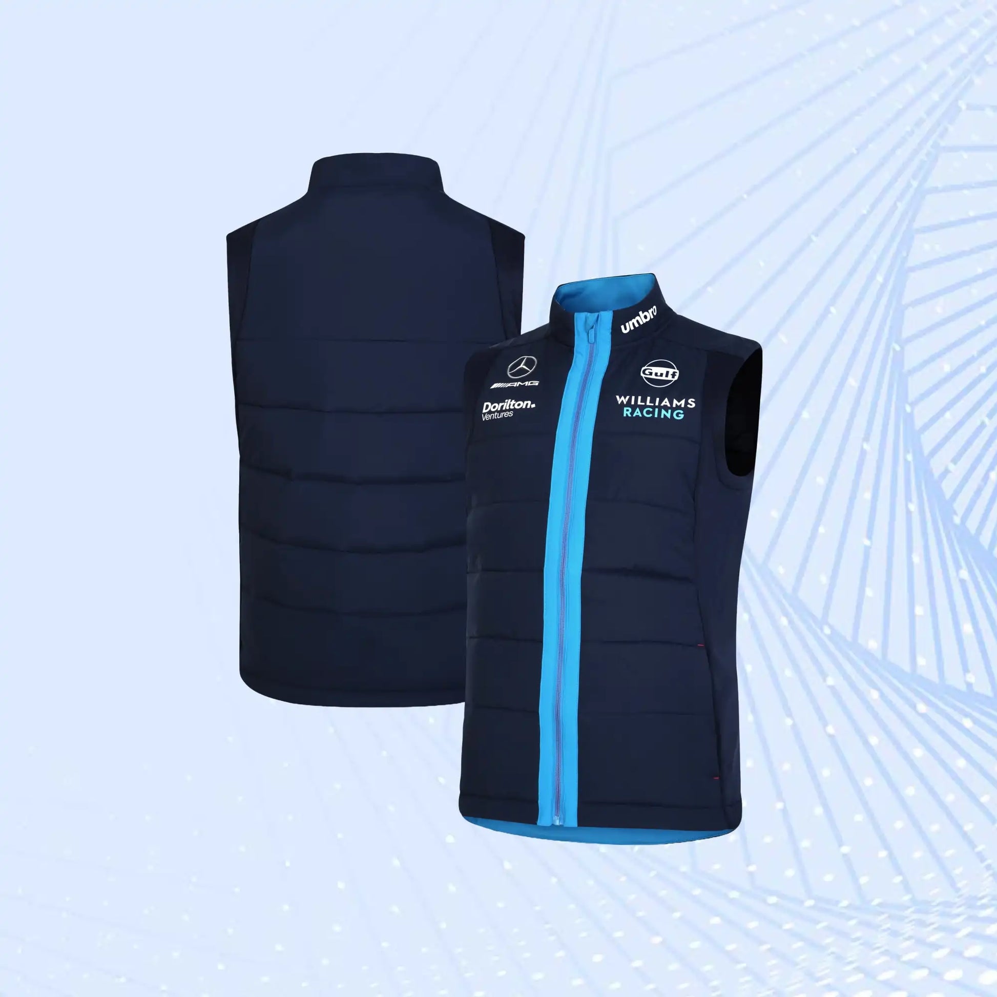 Show off your team spirit with the official Williams Racing 2023 Replica range. This team gilet is ideal for when you want some extra warmth but also need to retain maximum freedom of movement. The full zip ensures a secure and comfortable fit while the insulated front and back give ample protection from the cold. Angular side panels contain concealed zip pockets and the front and back feature heat-applied team and sponsor logos.